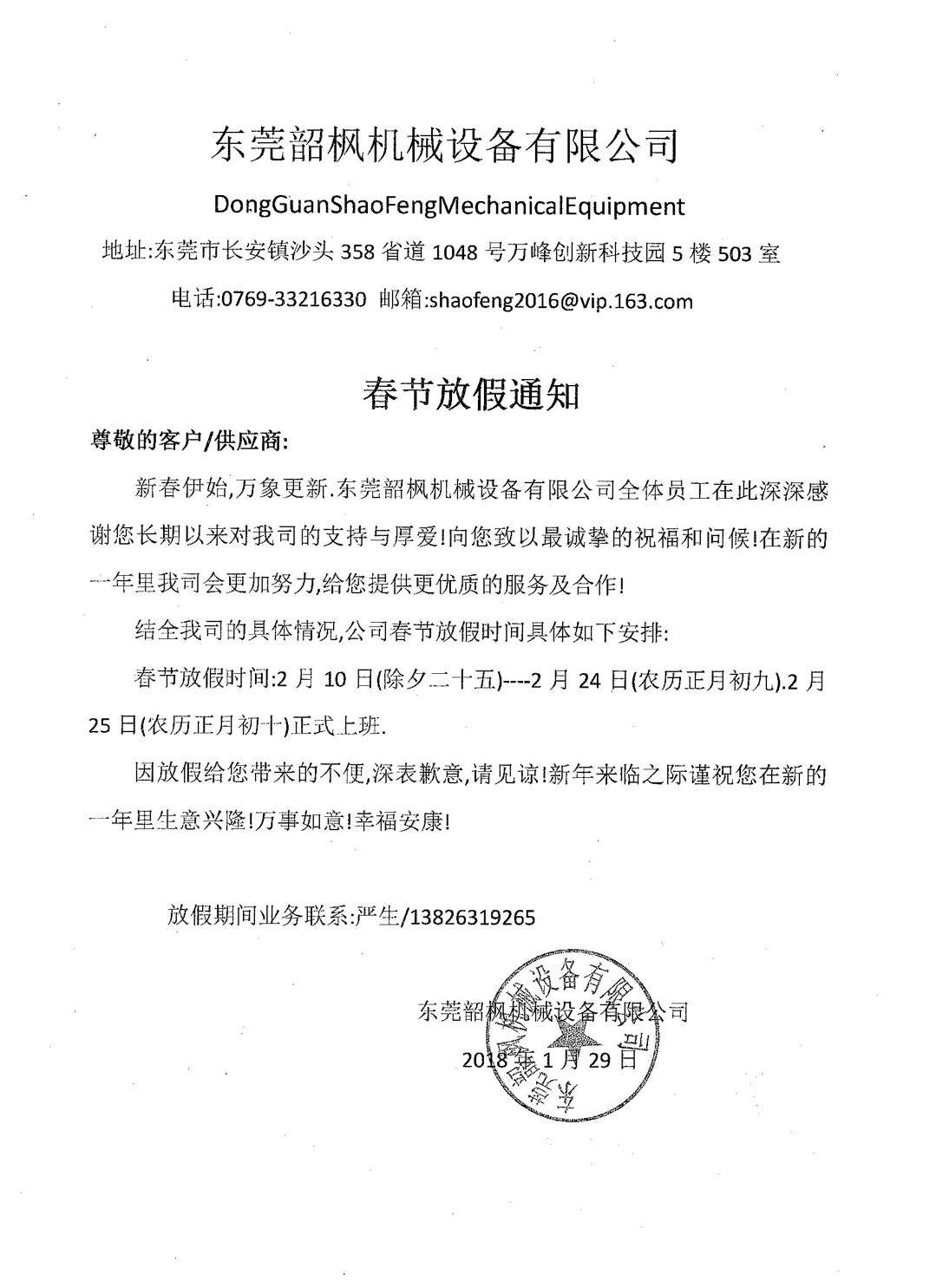 东莞韶枫机械设备有限公司春节放假通知
